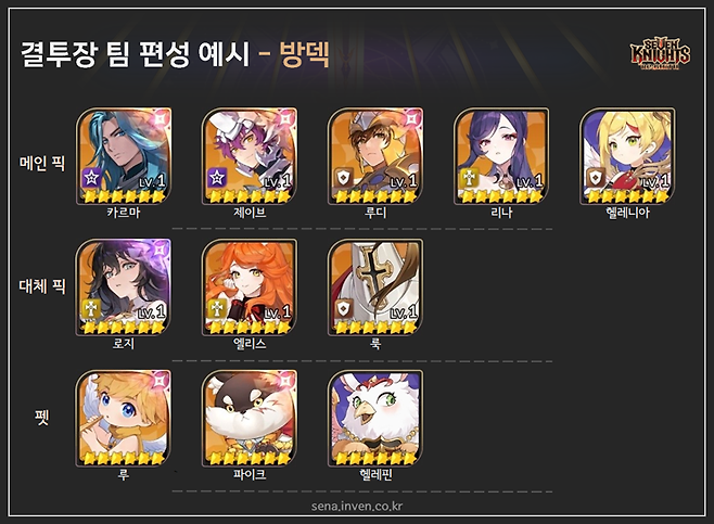 방덱 팀 편성헬레니아와 로지의 주전 경쟁 방덱은 카르마와 제이브, 루디, 리나 정도가 고정입니다. 남은 한 자리를 헬레니아와 로지가 경쟁 중이에요. 헬레니아는 공덱과 마덱을 상대할 때 유리하고 로지는 같은 방덱을 만났을 때 조금 도움이 된다는 평가죠. 로지가 없고 헬레니아를 키우기 전이라면, 룩이라는 무난한 선택지도 있습니다.