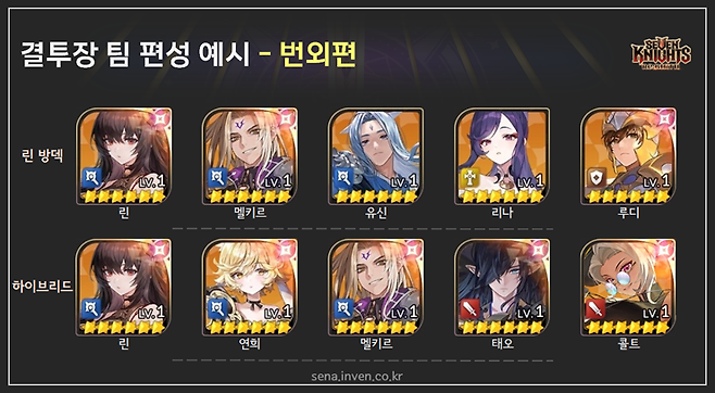 기타 팀 편성 방법하이브리드와 린 방덱 이제 막 결투장에 관심을 가지기 시작했다면, 보유 영웅 내에서 최선의 조합으로 가볍게 접근합시다. 픽업 소환에 모두 참여했을 시에는 해당 영웅들로 팀을 꾸려도 괜찮아요. 린과 연희, 멜키르, 태오, 콜트로 편성해도 멜키르 조건인 마법형 영웅 셋을 챙기며 적당히 갖춰진 조합이 나옵니다. 파이가 있다면 마법형 3인을 포기하는 선택도 있고요.