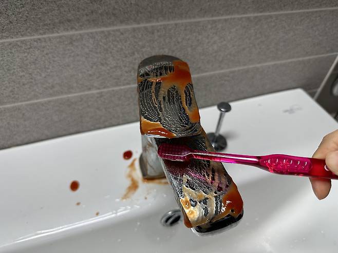그래서 이렇게 수전에 발라주면 광택도 나고 녹도 제거가 되면서 일석이조의 효과를 얻을 수 있어요. 수전 말고도 녹이 슬어 있는 곳에 발라주시면 녹이 제거가 돼요.