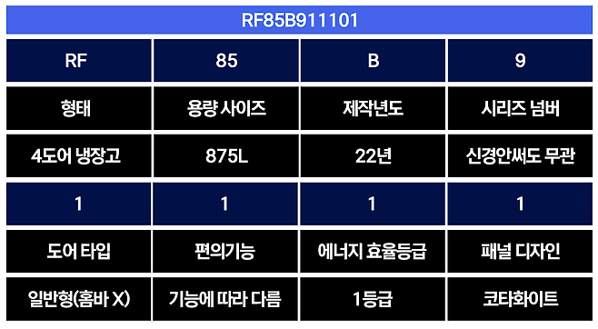 이런 22년 옵션 및 기능들이 포함되어 있는지는 모델명을 보면 대략적으로 알 수 있는데요, 예를 들어 'RF85B911101'의 경우 모델명을 분석했을때, '4도어, 875L 용량에 22년에 제작되고 홈바가 없는 1단계 편의기능을 가지며, 효율이 1등급, 코타화이트 도어를 가진 제품이다' 라는 것을 알 수 있습니다.