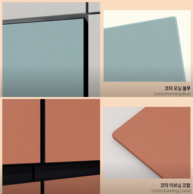 메탈 컬러를 입혀 구워낸 듯한 느낌의 재질이며, 펄이 들어간 느낌이 약간 나는 재질인 코타 메탈 모닝블루, 이브닝 코랄 색상이 추가되었습니다.