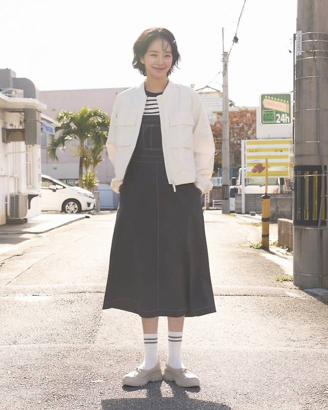 박규영이 화창한 거리에서 선보인 모던 캐주얼 룩이 시선을 사로잡고 있다. 흰색 오버사이즈 재킷과 검은색 롱 원피스의 대비가 세련된 분위기를 연출하고 있다. 스트라이프 패턴의 이너와 함께 매치한 이 스타일은 단정하면서도 트렌디한 감각을 드러내고 있다. 특히 흰색 양말과 베이지색 로퍼의 조합은 복고풍 감성을 더하며 전체적인 스타일에 포인트를 주고 있다. 짧은 단발 헤어스타일과 함께 어우러진 이 룩은 봄철 데일리 패션의 좋은 예시를 보여주고 있다.