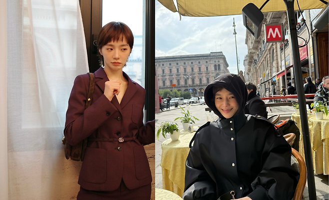 박규영이 선보인 버건디 컬러 수트는 강렬한 존재감을 발산하고 있다. 클래식한 더블 버튼 디자인의 재킷과 매치된 팬츠 수트는 세련된 비즈니스 룩을 완성하고 있다. 특히 GG 로고의 벨트로 허리라인을 강조하여 여성미를 더하고 있으며, 브라운 숄더백과의 조화가 고급스러운 분위기를 배가시키고 있다. 짧은 헤어스타일과 함께 연출된 이 룩은 현대적인 커리어 우먼의 세련된 감각을 대변하고 있다.
