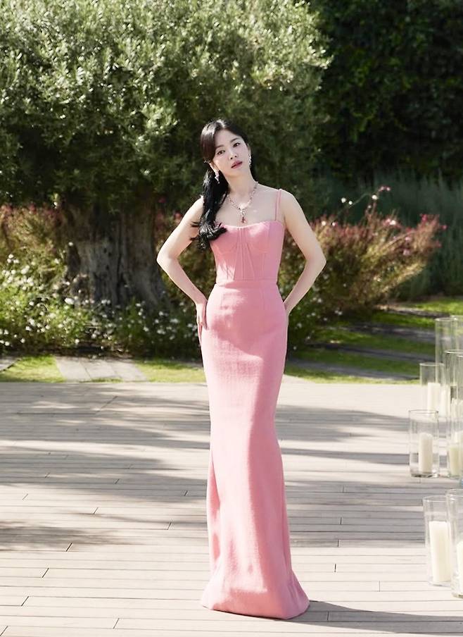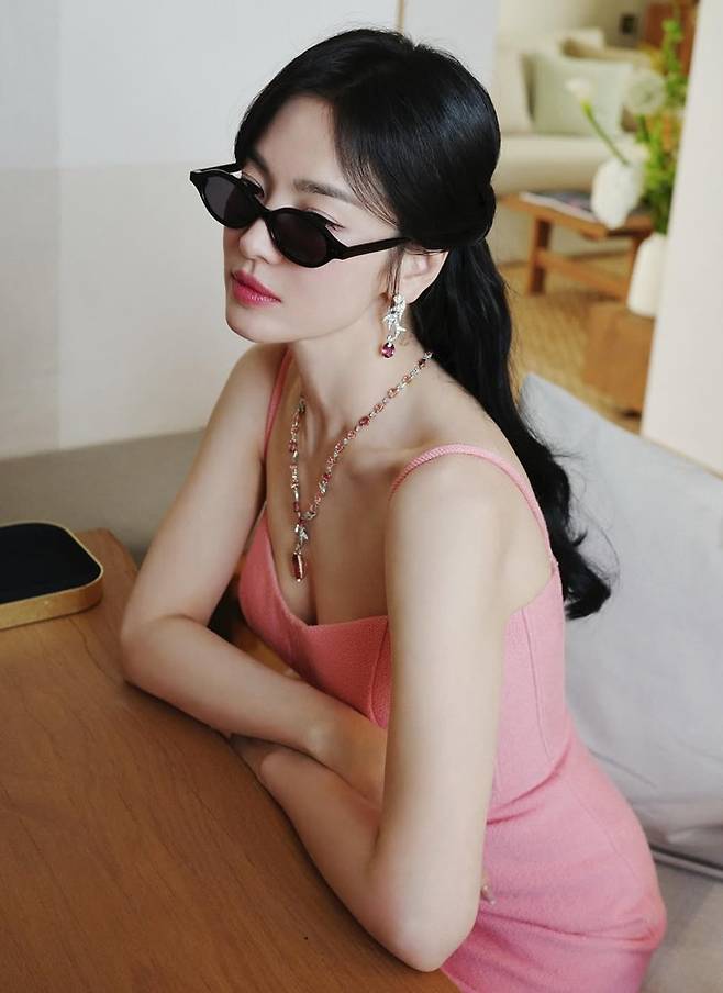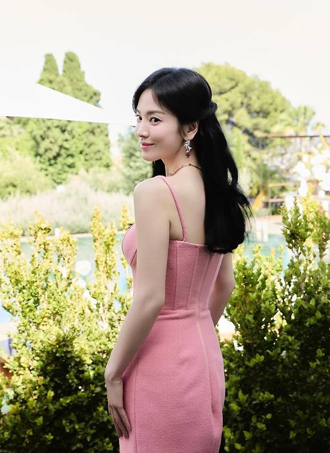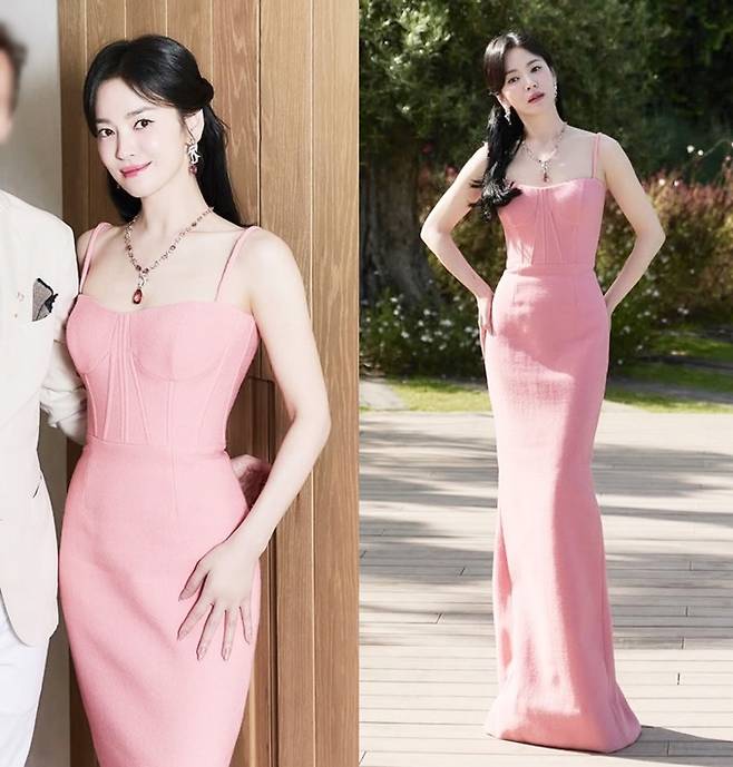 공개한 사진에서 송혜교는 쇄골라인 드러난 머메이드 핏의 핑크 롱 드레스룩으로 S라인 몸매를 과시했다.