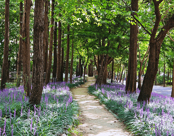 특히 일부 구간에서는 양옆으로 정돈된 맥문동이 자연스럽게 피어 있어 보랏빛 터널 같은 분위기를 연출하는데요. 바닥에는 나무칩이 깔려 있어 걷는 느낌도 부드럽고, 그늘이 많아 여름에도 햇살을 피하며 산책할 수 있다는 점이 매력적입니다.