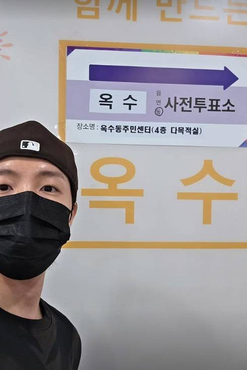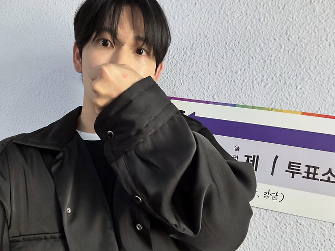 검은 점퍼 입고 투표 인증샷 찰칵! 손등 도장으로 귀엽게 포인트 주며, 투표 완료의 기쁨을 전했다.