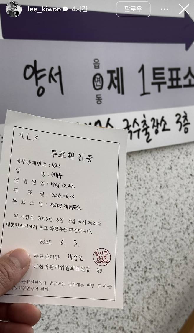 해외 일정 후 새벽에 입국하자마자 투표소로 직행! 손에는 투표확인증, 배경은 선명한 투표소 팻말. 시간까지 인증한 ‘열정 투표러’.