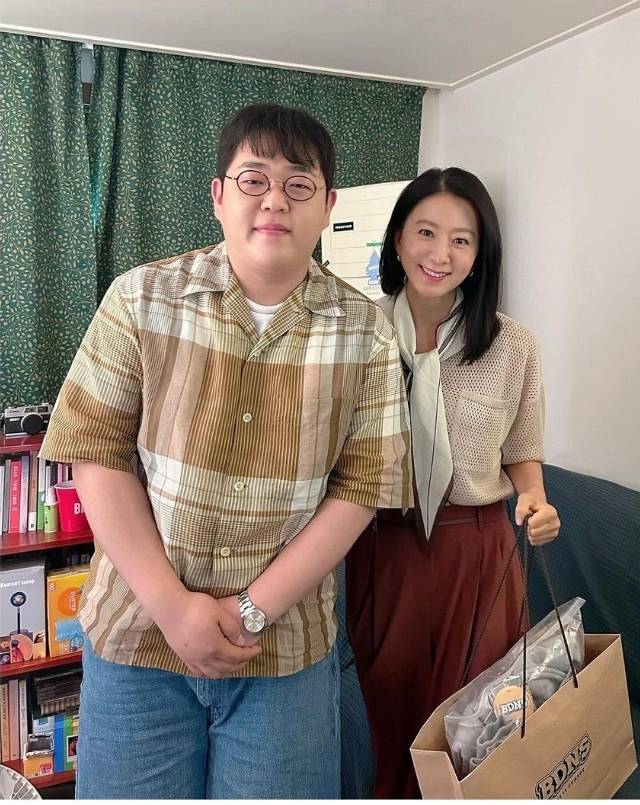 김희애는 베이지 반팔 그물 니트를 착용해 부드럽고 차분한 인상을 연출했습니다.