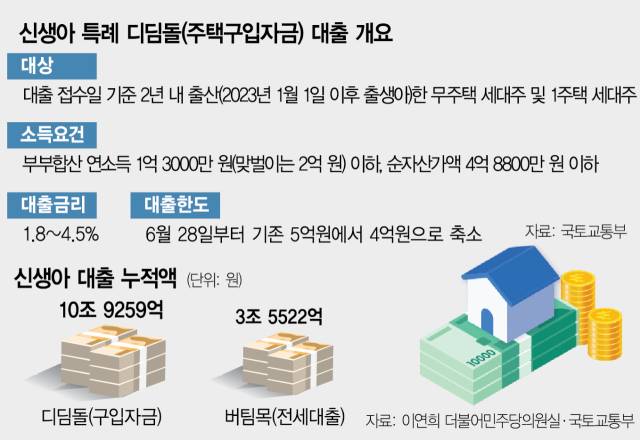 이연희 더불어민주당 의원이 국토부로부터 받은 자료를 보면 신생아 대출 신청액은 올해 1월 1조 439억 원에서 토지거래허가구역 해제 및 확대 지정 여파가 있었던 3월 1조 4323억 원으로 늘었다. 신생아대출 출시 후 올해 5월 말까지 1년 4개월간 집행된 대출액은 14조 4781억 원에 이른다. 구입 자금용인 디딤돌이 10조 9259억 원, 전세대출인 버팀목은 3조 5522억 원이다.