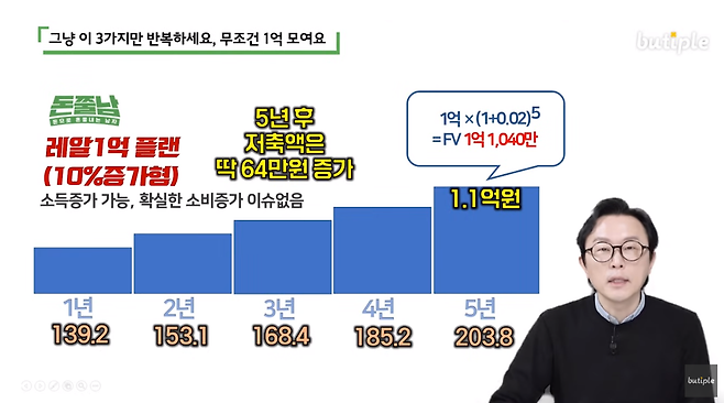 그리고 1년 후 딱 12만 8천 원을 더해서 월 141만 원을 저축해야 합니다. 그다음에는 154만 원, 그다음에는 167만 원 5년째에는 179만 원 저축하는 방법입니다.