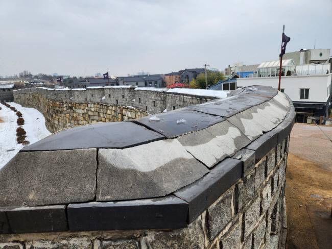 11일 경기 수원시 장안구 영화동 부근 장안문에서 뻗어 나간 화성 성곽길 곳곳은 균열로 몸살을 앓고 있었다. 여장(성 안의 군사가 몸을 은폐한 채 공격할 수 있도록 일부러 구멍을 낸 벽)에는 손가락이 들어갈 정도의 틈이 난 곳(사진)이 적지 않게 눈에 들어왔다. 장안문 서쪽에 있는 성벽 돌출부인 북서적대의 경우 바닥에 금이 가 있었고 벽돌이 부서진 곳이나 덮개가 깨져 있는 모습도 어렵지 않게 찾아볼 수 있었다. 최근 기온차가 심해지고 눈·비가 많이 내리면서 풍화에 따른 훼손 부위도 점점 커지고 있다.