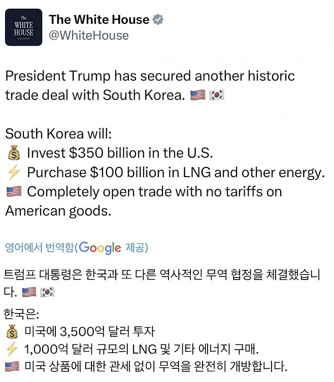 이번 협상에서는 한국이 미국 산업 활성화를 위해 3,500억 달러(약 455조 원)를 투자하고, 2028년까지 1,000억 달러 규모의 미국산 에너지를 구매하기로 한 내용이 포함됐습니다. 관세율은 자동차를 포함해 15%로 조정됐습니다. 다만 투자 수익의 90%가 미국 정부에 귀속된다는 백악관 설명에 대해서는 한국 정부가 “구체적인 내용은 펀드 운영 과정에서 확정될 것”이라며 신중한 태도를 보였습니다.