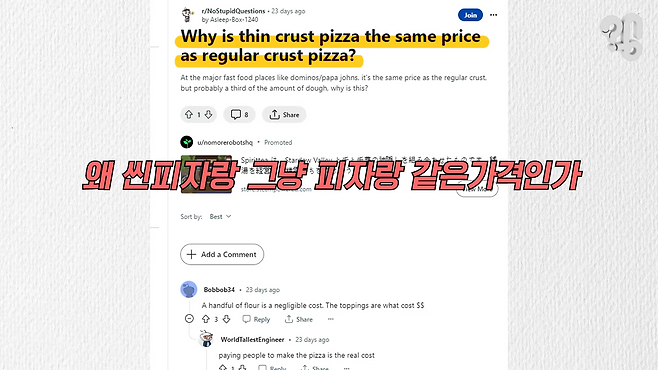 사실 같은 질문은 해외에서도 꾸준히 제기됐다. 요약하면 양도 적은데 비싸기까지 하니 이거 ‘호구’ 잡히는 거 아니냐는 그런 의문이다. 이걸 보면 외국이라고 해서 딱히 씬피자가 일반 피자보다 싼 건 아닌 모양이다.