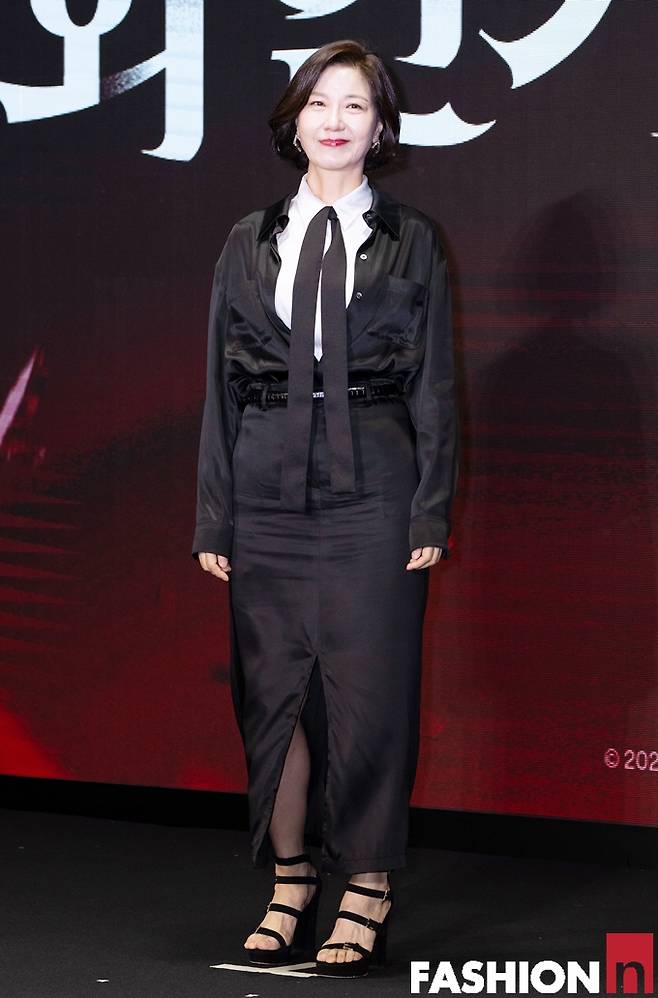 이날 서이숙은 블랙 셔츠와 블랙 슬릿 스커트를 입고 화이트 셔츠에 블랙 타이를 맨 블랙앤화이트 나들이룩으로 시크하면서도 포스 넘치는 카리스마를 발산했다.