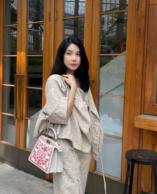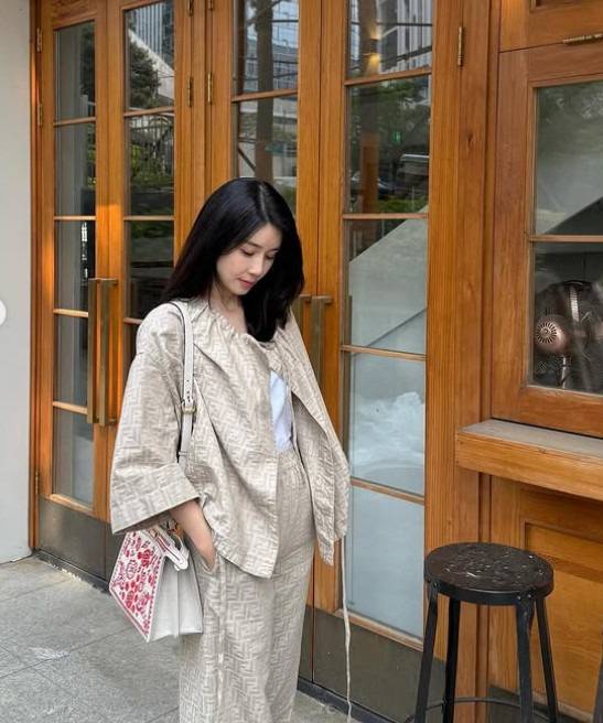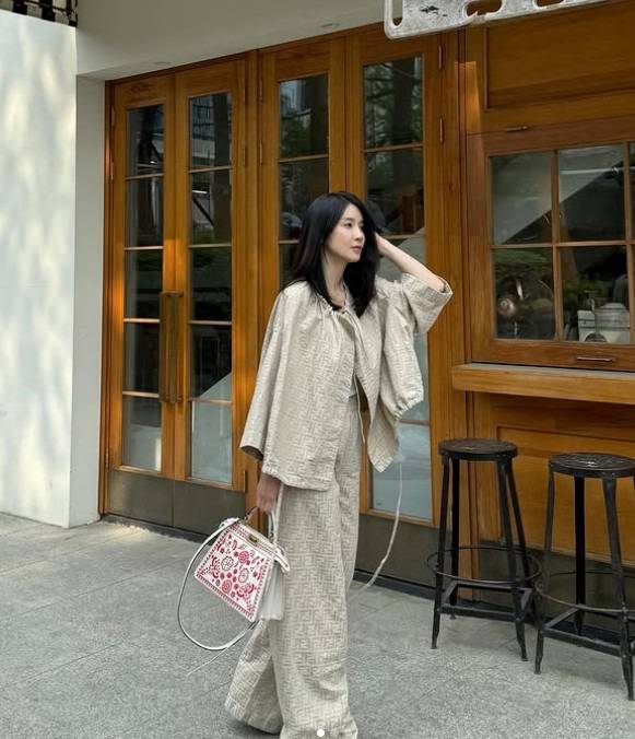 브랜드 펜디의 셋업이 가장 먼저 눈에 들어오네요. 베이지 톤이 차분함을 연출해요.