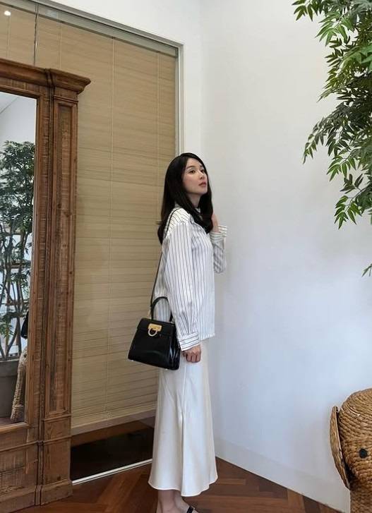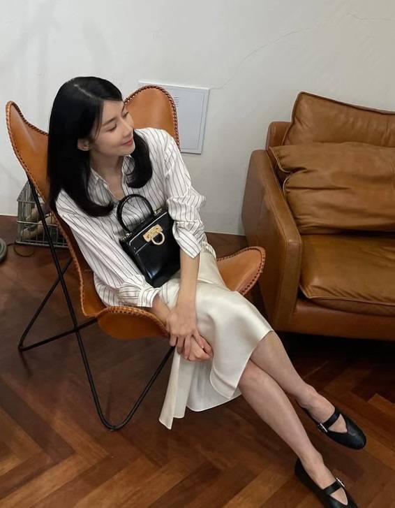 스트라이프 셔츠에 새틴 스커트. 간단한 조합이지만 고급스러워요.
