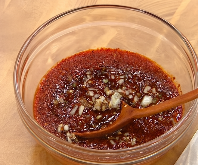 식힌 국물에 진간장, 고춧가루, 마늘, 파, 물엿, 참기름을 섞어 양념장을 만듭니다.
