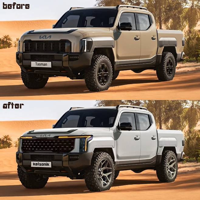 벌써부터 기아 타스만 픽업트럭의 페이스리프트 예상도가 등장해 관심을 끌고 있다.