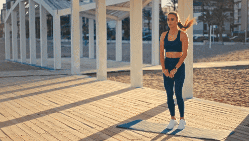 매트에 서서 두 발을 모으고 팔은 몸 옆에 자연스럽게 둔 상태로 시작합니다. 점프하면서 다리를 어깨너비보다 넓게 벌립니다. 동시에 두 손을 머리 위로 들어 올립니다. 다시 점프하여 발을 모으는 동시에 손을 몸 옆으로 내립니다.