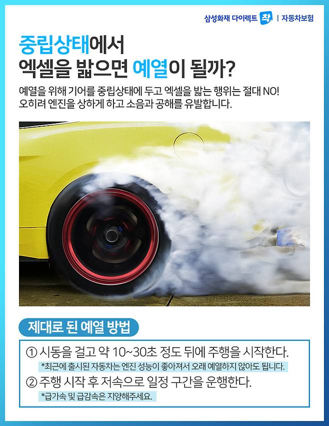 간혹 빠르게 예열하기 위해 기어를 중립상태에 두고 엑셀을 밟아 예열을 하는 경우도 있습니다. 하지만, 이 행동은 예열에 전혀 도움이 되지 않습니다. 오히려 소음과 공해만 일으키고 엔진을 손상시킵니다.