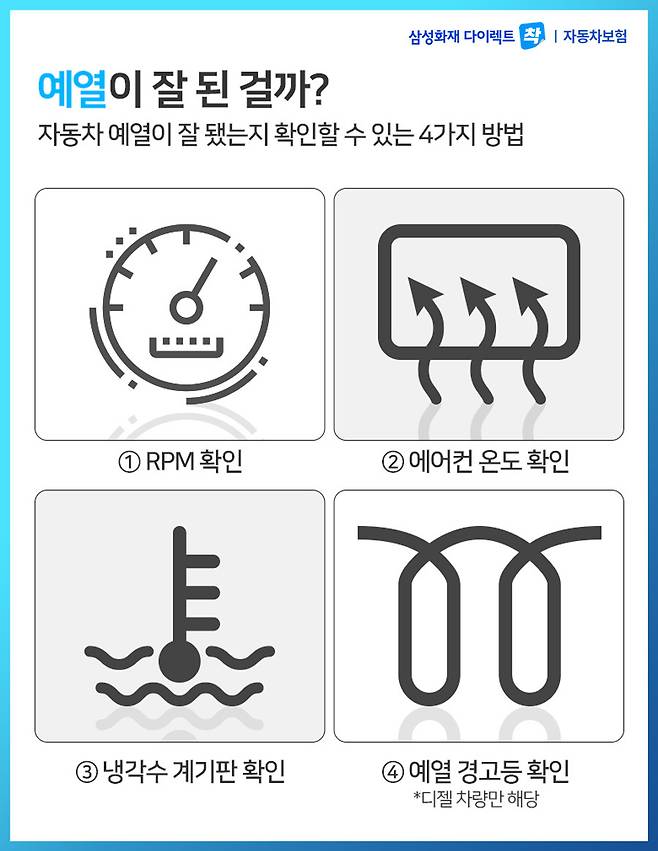 사람이 운동 전에 준비운동을 하는 것처럼 자동차도 주행 전 예열을 하여 혹시 모를 사고와 고장에 대비합시다. 운전 습관을 조금만 바꾼다면 내 차의 수명이 늘어납니다. 예열과 후열을 습관화하여 내 차와 오래오래 안전운전하세요!