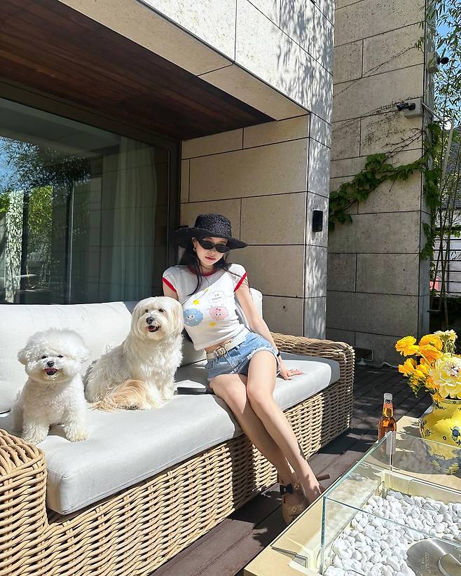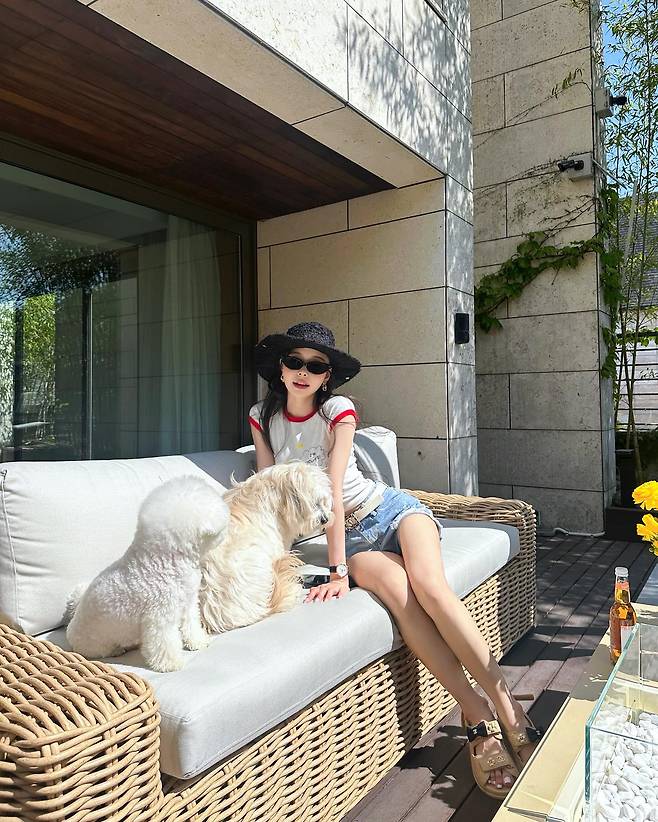 햇살 아래 테라스, 강아지들과 함께한 순간까지도 패션의 연장이었던 이번 프리지아의 룩, 너무 사랑스럽죠.