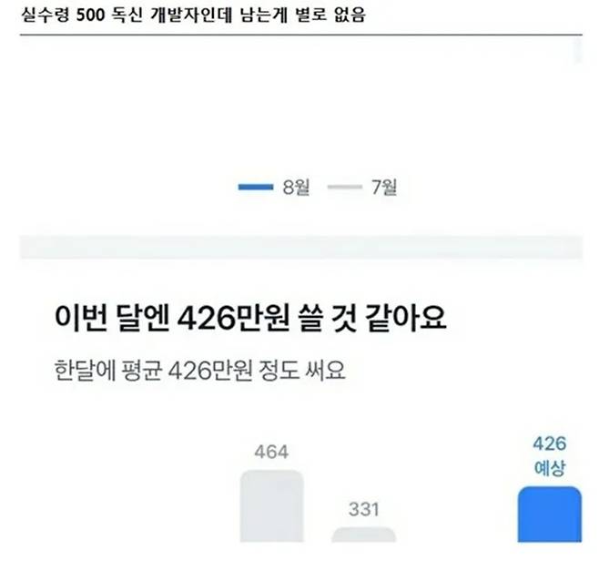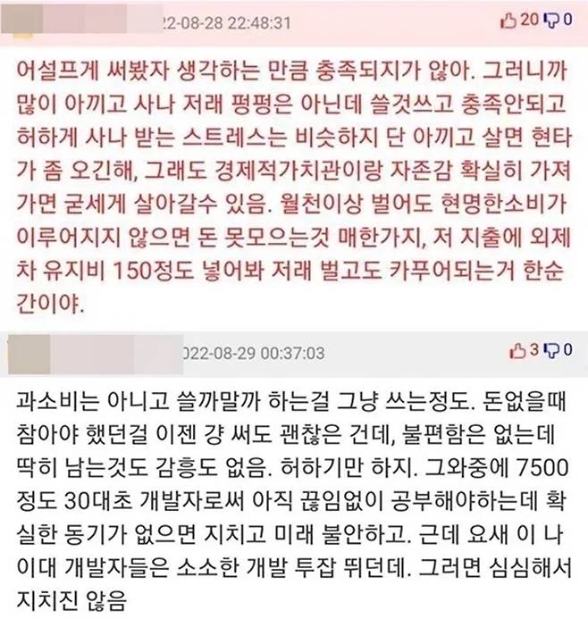 한 커뮤니티에 월급 500만 원 개발자의 신세 한탄 게시물이 화제가 되었다. 30대, 월급 500 받는 개발자라면 나름 만족하면서 살 듯싶다. 월급 일부는 저축하고, 일부는 투자하고, 일부는 고정비 내고, 일부는 개인 생활에 쓰면 넉넉하지 않을까 싶다. 그러나 정작 글쓴이는 본인 삶이 행복하지 않다고 말한다. 내용을 살펴보자