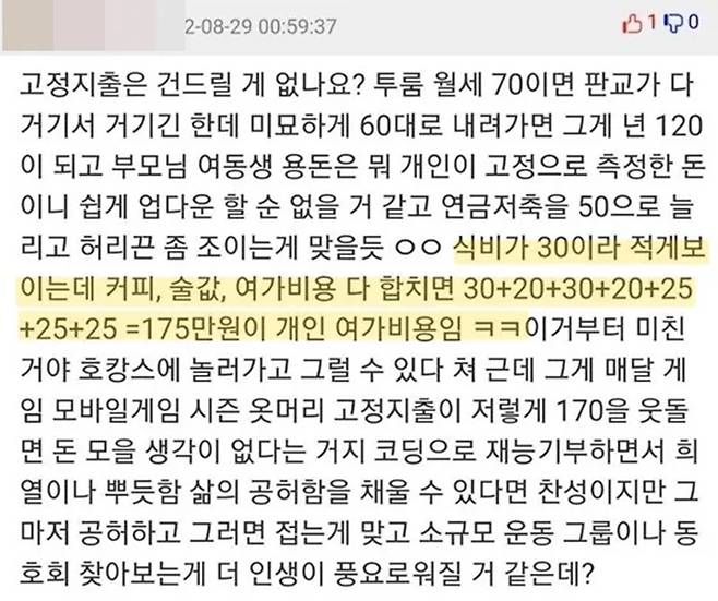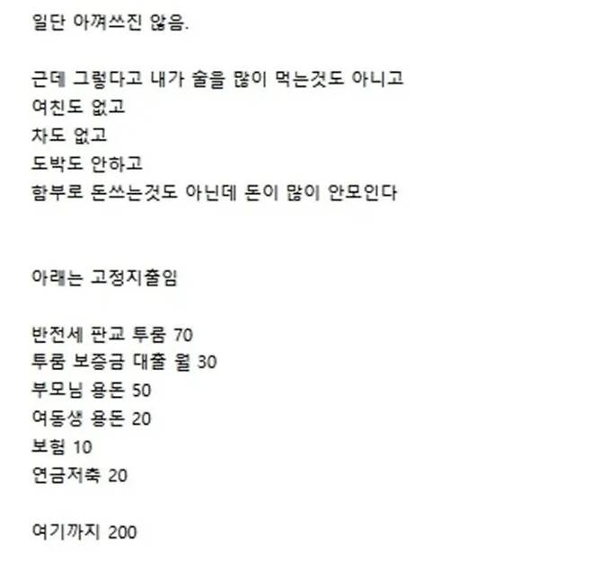 일단 글쓴이는 용돈부터 끊어야 한다. 부모님이 아프거나, 가족 전부가 일할 수 없을 정도로 상황이 좋지 않다면 글쓴이는 어쩔 수 없이 가장 노릇을 해야 한다. 그러나 가족들 모두 각자 일하고, 어느 정도 생계를 유지할 수준이라면 굳이 매달 70만 원씩 용돈을 줄 필요가 있을까 싶다. 아무리 가족이 중요하다고 해도, 가족에게 증여할만한 재산이 있지 않은 이상 가족은 목돈을 만드는 데 큰 도움이 되지 않는다.