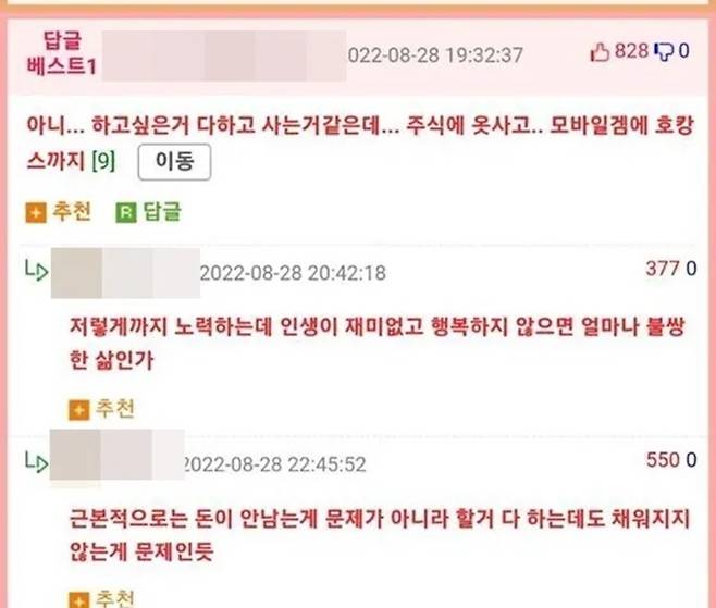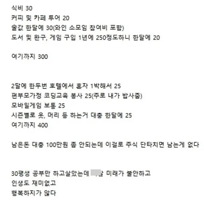 나이 들어서 후회하기 전에 젊을 때부터 경제 공부를 하면서 저축과 투자를 꾸준히 해야 한다. 특히 글쓴이처럼 월급을 많이 받는 직장인이라면 훨씬 더 일찍 큰돈을 모을 기회가 주어졌다. 그러니 마음이 공허하다는 ‘핑계’로 이상한 곳에 돈 쓰지 말고, 옳은 곳에 돈을 잘 굴리길 바란다.