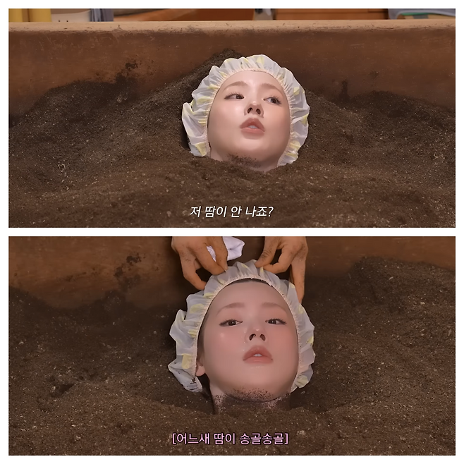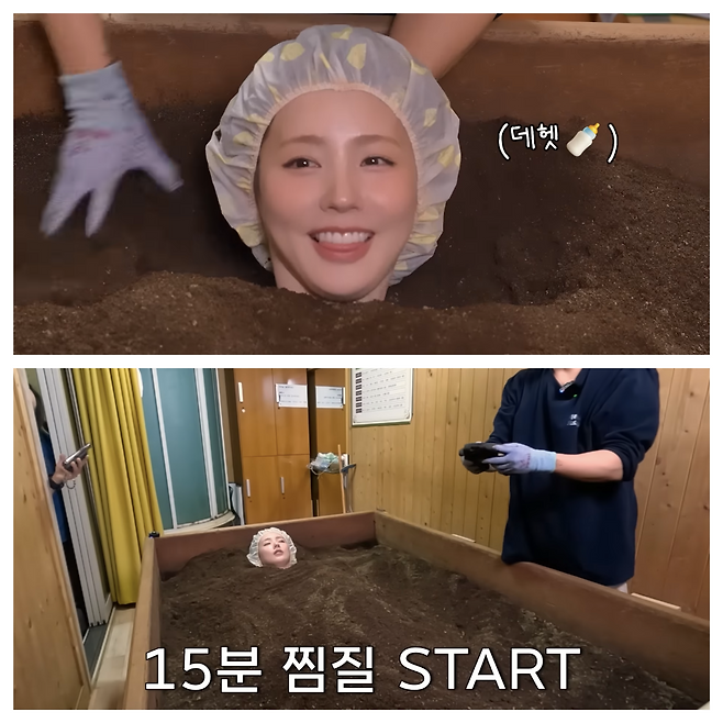 몸을 효소에 깊게 묻고 가만히 15분 버티는 방식인데 초반에는 “땀 안 나는 것 같아요”라던 미연도중 후반에는 “우와 땀난다!”며 열이 확 오르는 걸 느꼈어요.