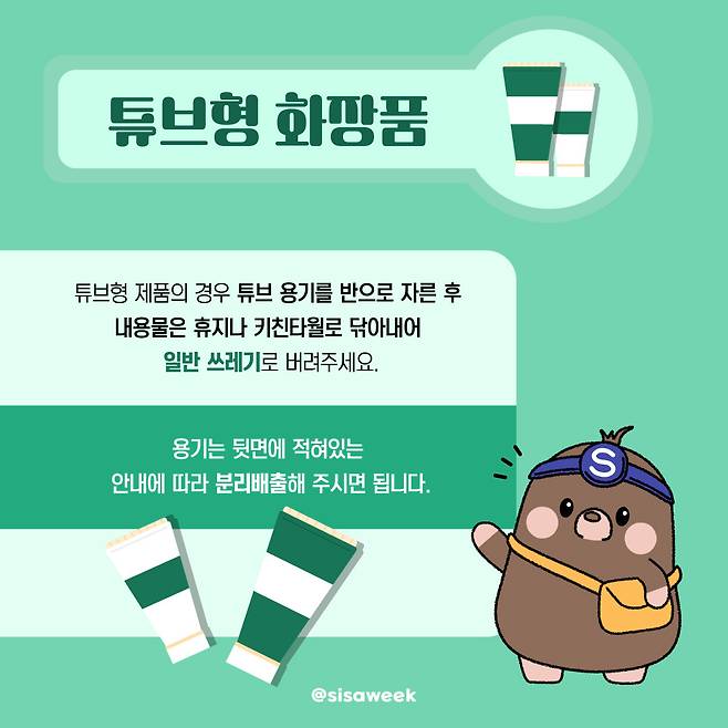 튜브형 제품의 경우 튜브 용기를 반으로 자른 후 내용물은 휴지나 키친타월로 닦아내 일반 쓰레기로 버려주세요. 용기는 뒷면에 적혀있는 안내에 따라 분리배출해 주시면 됩니다.
