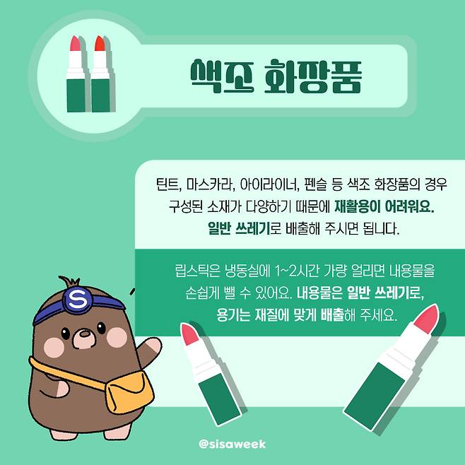 틴트, 마스카라, 아이라이너, 펜슬 등 색조 화장품의 경우구성된 소재가 다양하기 때문에 재활용이 어려워요.일반 쓰레기로 배출해 주시면 됩니다. 립스틱은 냉동실에 1~2시간 가량 얼리면 내용물을 손쉽게 뺄 수 있어요. 내용물은 일반 쓰레기로, 용기는 재질에 맞게 배출해 주세요.