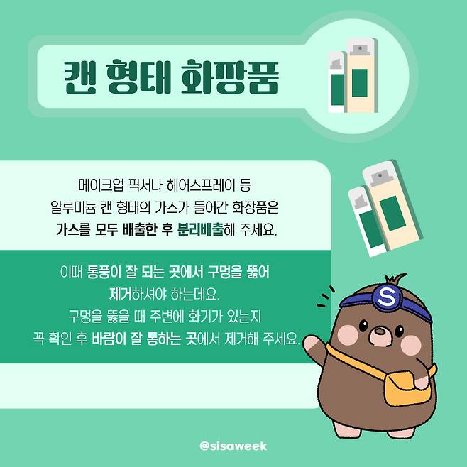 메이크업 픽서나 헤어스프레이 등 알루미늄 캔 형태의 가스가 들어간 화장품은 가스를 모두 배출한 후 분리배출해 주세요. 이때 통풍이 잘 되는 곳에서 구멍을 뚫어 제거하셔야 하는데요. 구멍을 뚫을 때 주변에 화기가 있는지 꼭 확인 후 바람이 잘 통하는 곳에서 제거해 주세요.
