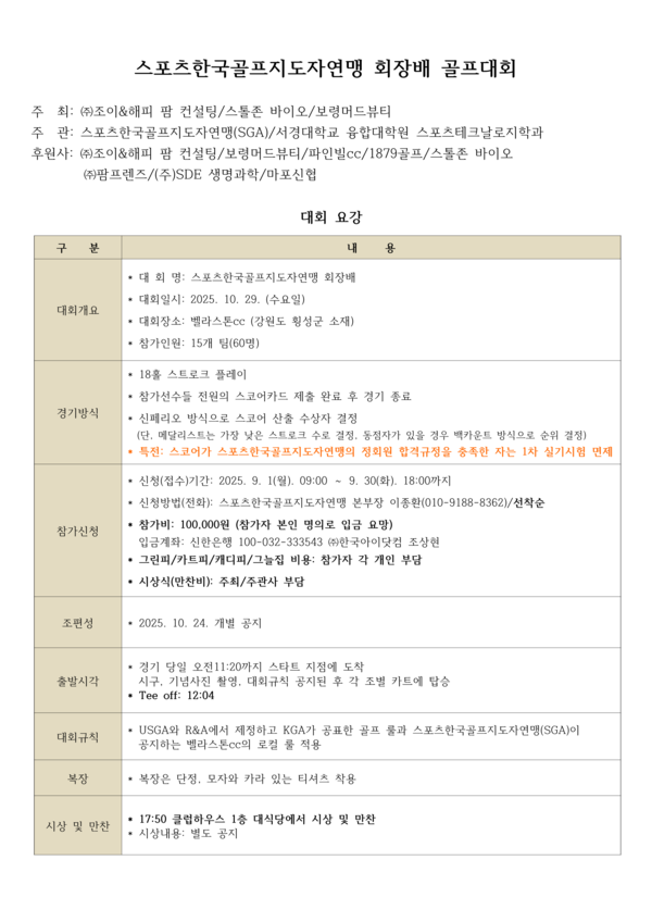 스포츠한국골프지도자연맹(SGA·회장 조상현)은 오는 10월29일 강원도 횡성의 벨라스톤컨트리클럽에서 골프 마니아 60명을 초청해 '2025 스포츠한국지도장연맹 회장배 골프대회'를 개최한다.