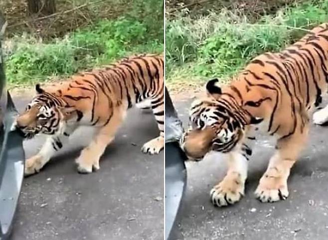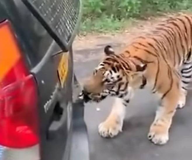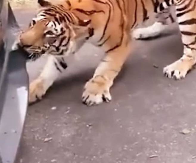자칫 잘못하면 큰 일이 일어날 수도 있었던 상황. 아무래도 호랑이가 도와주고 싶은 마음에 겁도 없이 차량 뒷범퍼를 깨문 것으로 보여지는데요.