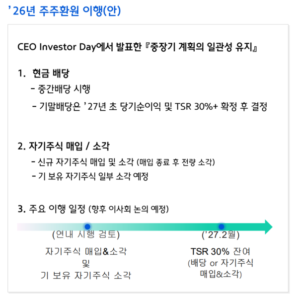 자사주 소각의 기준은 총주주환원율(TSR) 30%+ 충족이다. TSR 30%+에서 자사주 매입·소각과 배당의 비중을 탄력적으로 조정할 계획이다.