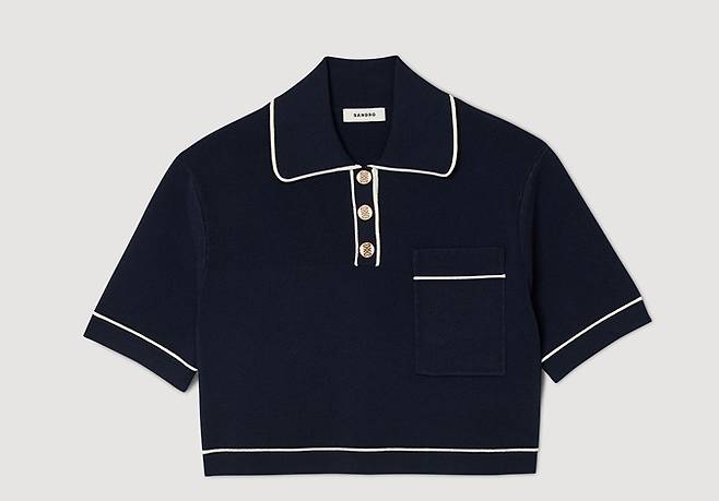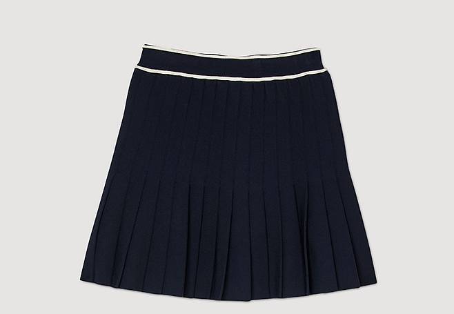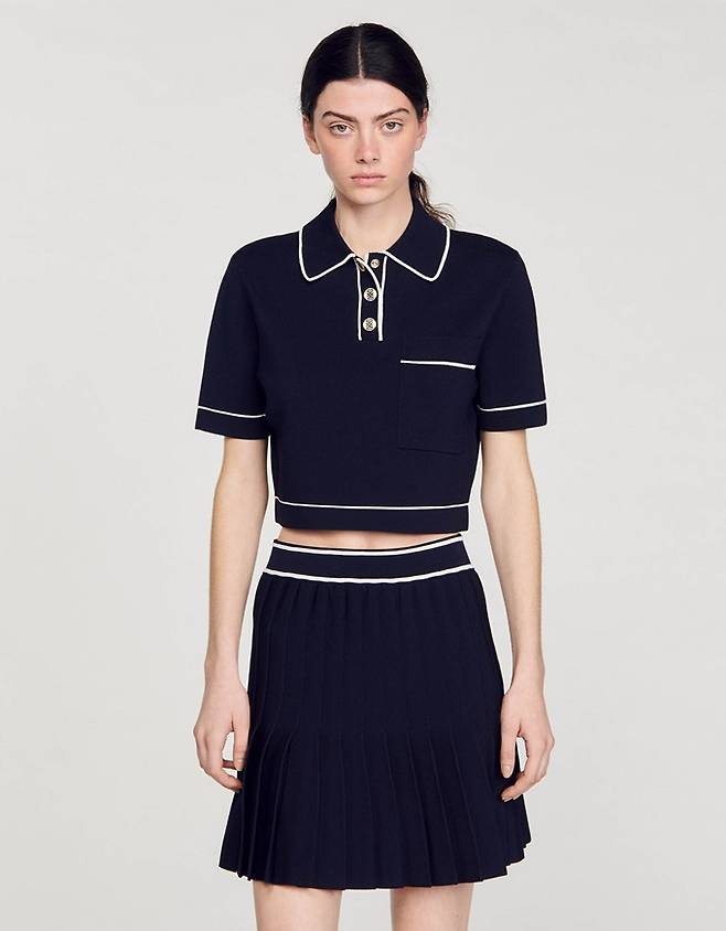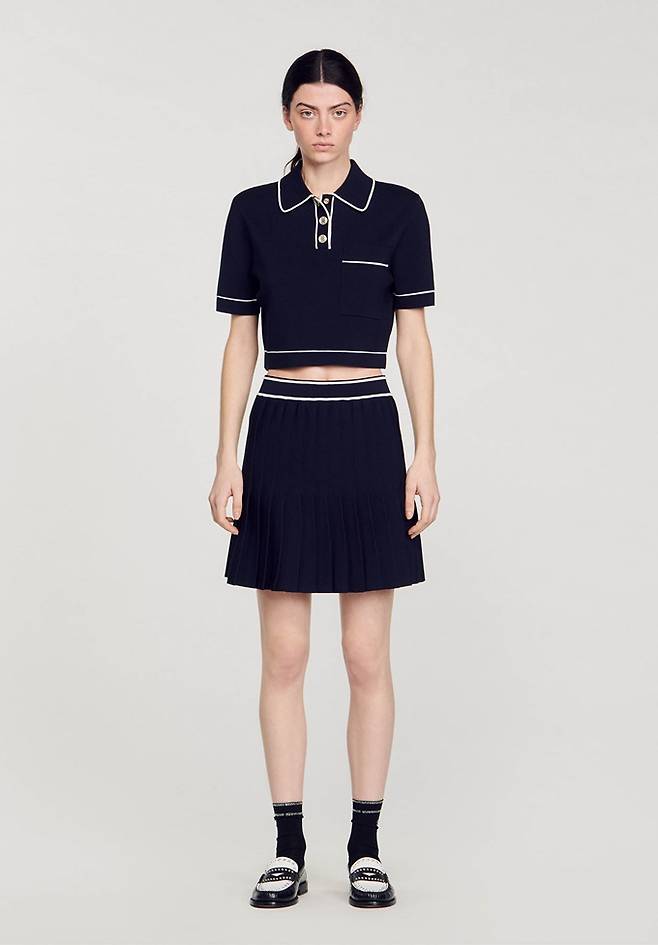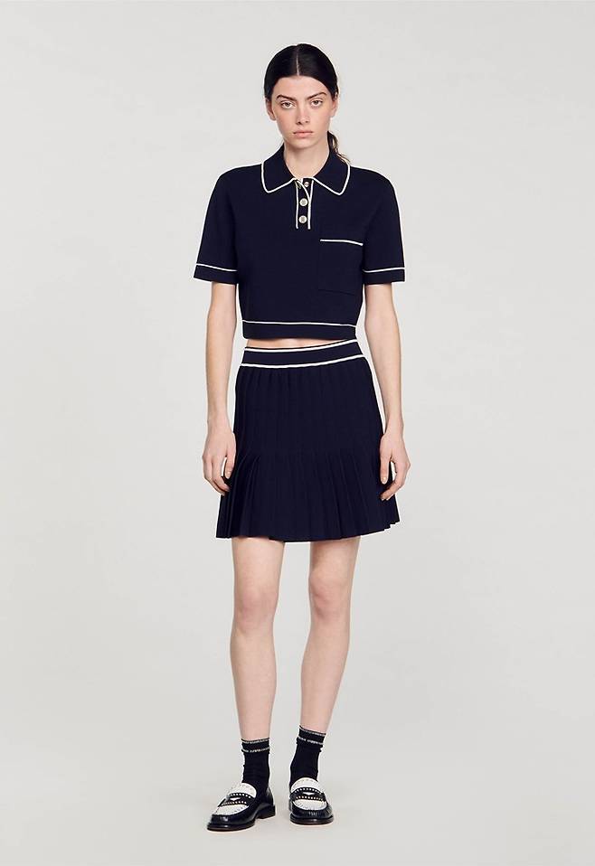 프렌치 컨템포러리 '산드로' 폴로 크롭 니트와 플리츠 니트 스커트로 구성된 러블리 프레피룩