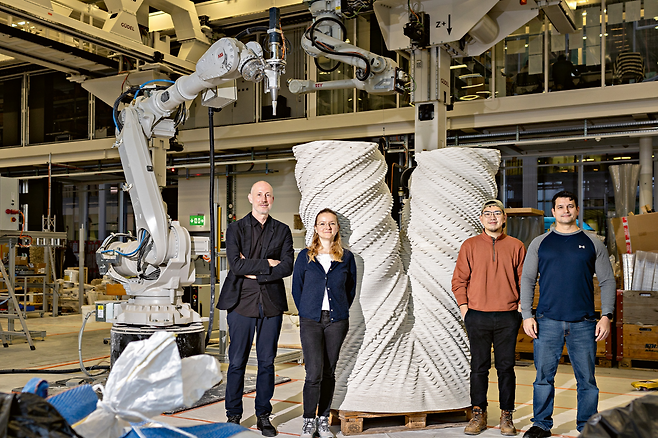 한 로봇이 콘크리트를 여러 겹으로 시공하는 동안, 다른 로봇은 20cm 간격으로 새로운 구조물에 링 형태의 보강재를 배치했다. 링 형태의 수평 보강재는 프린팅 후 추가되는 세로 철근으로 보완됐다.
