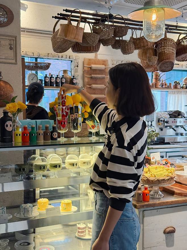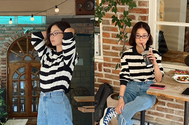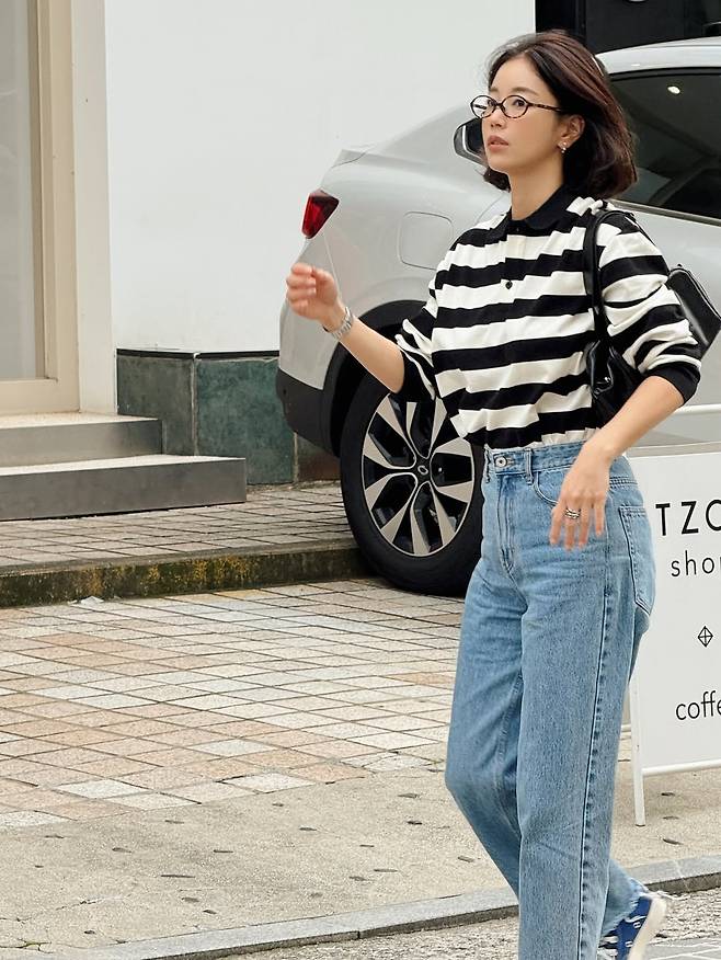 그녀는 흑백 스트라이프 패턴의 카라 티셔츠에 연청 데님 팬츠를 매치하여 편안하면서도 경쾌한 캐주얼룩을 선보였습니다.