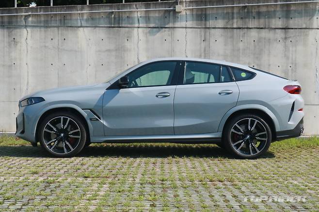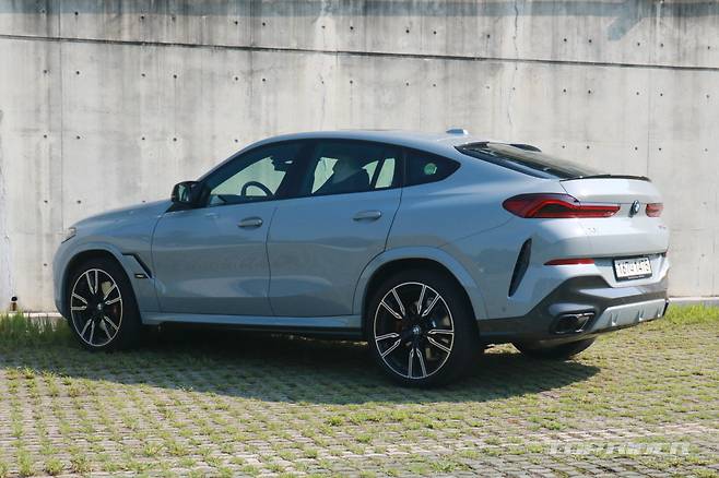 측면부는 X6의 최대 장점이다. 매끄럽게 떨어지는 루프라인은 다른 쿠페형 SUV와 비교해 자연스럽고 가장 스포츠 세단에 가깝다. 블랙 하이그로시 M 사이드미러, 22인치 휠이 제공된다. 타이어는 전륜 275/35R22 후륜 315/30R22다. 후면부 디자인은 이전 모델과 유사하다.