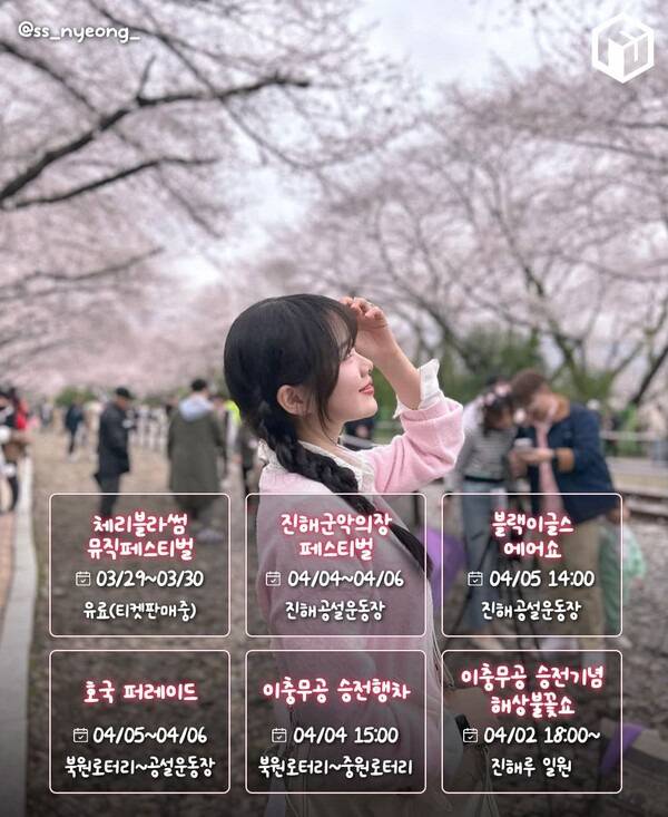 2025 진해 군항제 기간 동안 진해 곳곳에서는 다채로운 볼거리와 체험 프로그램들이 펼쳐집니다. 벚꽃에 둘러싸여 인기 가수들의 공연을 관람할 수 있는 '체리블라썸뮤직페스티벌'은 현재 얼리버드 티켓이 오픈된 상태입니다. 3월 29일부터 30일까지 공연이 이어지니 관심있으신 분들은 티켓을 사전에 구매하시길 바랍니다.