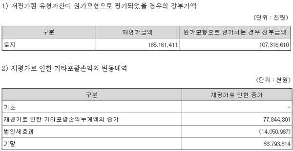 토지 자산의 가치상승분이 회계상 자본총계를 늘리는 역할을 했기 때문이다. 기업의 자산이 재평가되면서 이익이 발생하면 손익계산서상 ‘기타포괄손익’으로 처리된다. 자본항목 중에서는 ‘기타포괄손익누계액’으로 계상된다. 세무상으로는 재평가 차익에 잠정적인 법인세 부채가 발생하기 때문에 그 영향을 고려해 최종 자본에는 법인세 효과를 차감한 금액으로 반영된다.