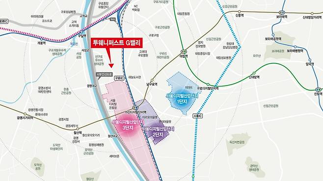 무엇보다 해당 단지의 가장 큰 장점은 바로 ‘G밸리’에 위치해 있다는 점이다. 서울디지털국가산업단지(G밸리)는 지식·정보·IT 산업의 중심지로 구로디지털단지와 가산디지털단지가 인접해 있어 많은 기업과 근로자가 밀집해 있다.
