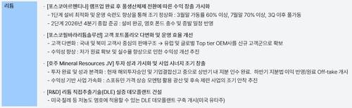포스코그룹은 아르헨티나에서 리튬 생산 설비가 본격적인 램프업(Ramp-up)을 거쳐 수익 창출 단계에 진입한다고 밝혔다. 1단계 설비는 올해 3월 말 가동률 60% 이상을 확보하고 3분기 이후부터는 완전가동 체제로 전환될 예정이다. 4분기 중에는 2단계 설비의 종합 준공을 마무리해 생산 능력을 더욱 확충하겠다고 구상했다. 고객 포트폴리오 다변화와 호주 합작법인 지분 인수 완료 등을 통해 리튬 사업의 수익 기여에 박차를 가하겠다고 부연했다.