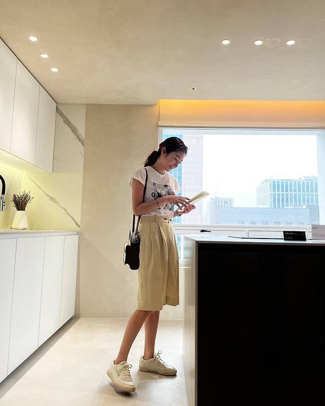 세 번째 사진에서 왕지원은 밝은 톤의 주방에서 내추럴한 캐주얼룩을 선보이고 있다. 프린팅 티셔츠에 하이웨이스트 베이지 컬러의 버뮤다 팬츠를 매치해 편안하면서도 단정한 분위기를 자아낸다. 크림색 스니커즈와 미니 크로스백으로 실용성을 더했으며, 머리는 자연스럽게 묶어 활동성을 강조했다. 전체적으로 미니멀하면서도 세련된 일상복 스타일이다