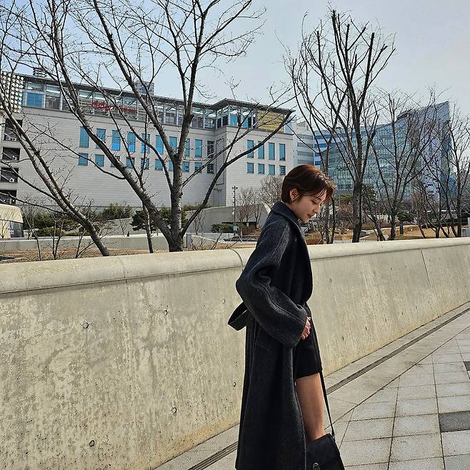 네 번째 사진에서는 블랙 롱코트와 블랙 쇼츠를 매치해 시크한 겨울 패션을 보여준다. 롱코트의 클래식함과 쇼츠의 경쾌함이 조화를 이루며, 블랙 숄더백으로 통일감을 준다. 도심의 배경과 어우러져 도시적인 세련미가 돋보인다