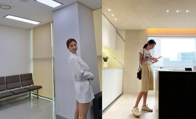 두 번째 사진에서는 올 화이트 셋업으로 깔끔한 이미지를 연출하고 있다. 화이트 셔츠와 쇼츠의 조합으로 시원하면서도 포멀한 느낌을 주며, 미니멀한 화이트 백으로 완성도를 높였다. 헤어는 단정하게 묶어 전체적인 룩의 정돈된 인상을 강조한다