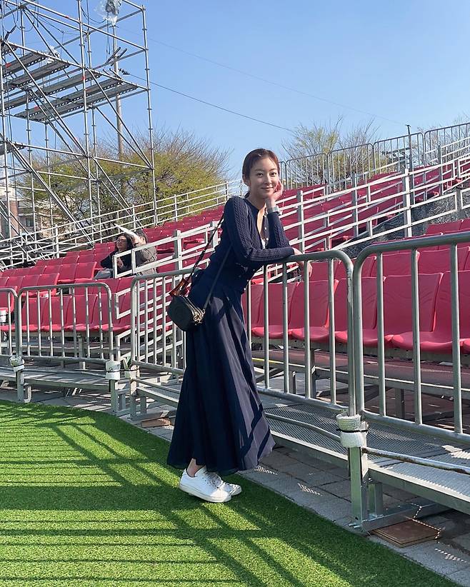 첫 번째 사진에서 왕지원은 네이비 컬러의 롱원피스를 착용해 우아한 분위기를 연출한다. 심플한 디자인의 원피스에 화이트 스니커즈로 캐주얼함을 더했고, 블랙 미니 크로스백으로 포인트를 주었다. 자연광과 어우러진 모습이 한층 더 여성스러운 무드를 자아낸다