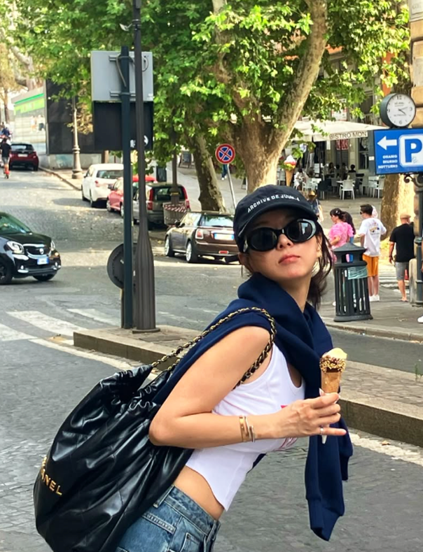 특히 블랙 컬러의 샤넬 백은 전체 룩에 고급스러운 포인트를 주며 럭셔리 무드를 강조했다.