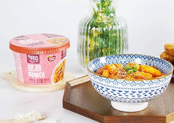 동원F&B의 ‘떡볶이의신 로제 컵떡볶이’는 매콤달콤한 떡볶이 소스에 고소한 로제 풍미를 느낄 수 있는 제품이다. 먹기 좋게 한입 사이즈로 만든 쌀떡과 매콤한 고춧가루, 그리고 고소한 크림으로 맛을 낸 소스가 들어있다. 빈 용기에 떡과 분말 소스를 넣은 후, 뜨거운 물을 부어 전자레인지로 조리하면 된다. 물 대신 우유를 넣어도 맛있게 먹을 수 있다. 편의점, 마트 등지에서 2천 원 내외의 판매가로 만날 수 있다.